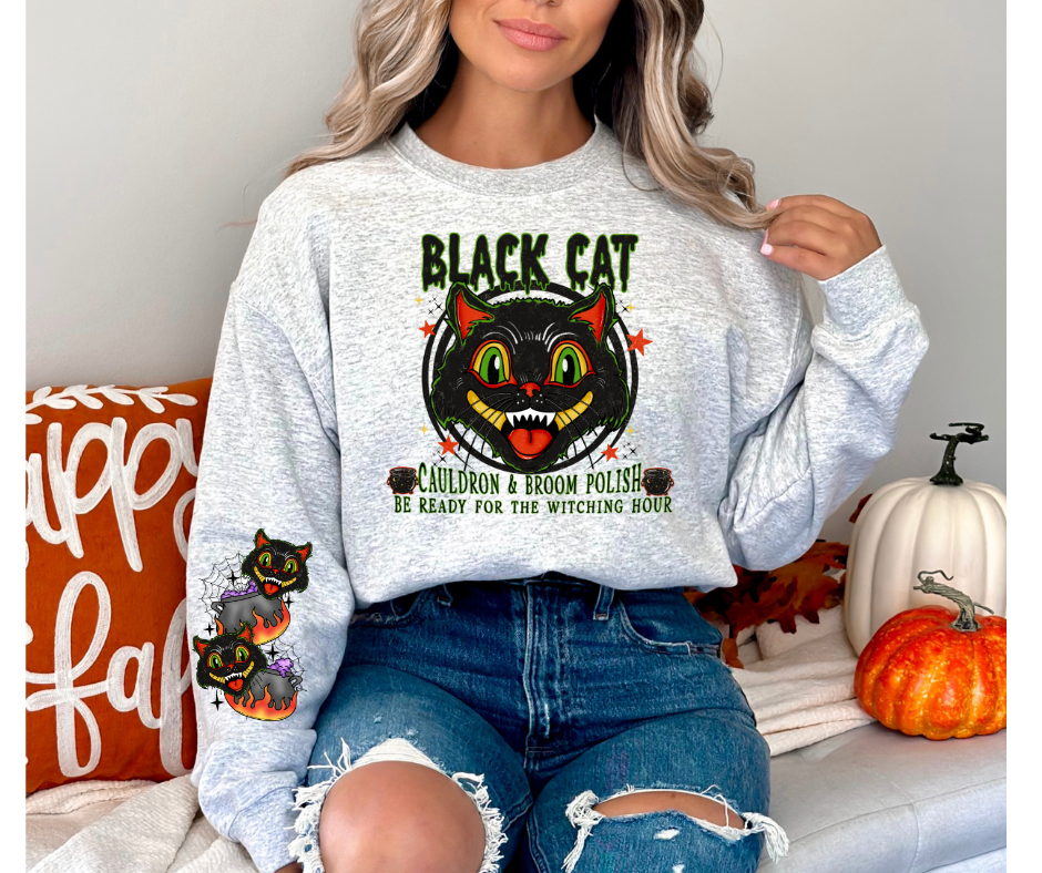 Get ready to be the coolest cat at the Halloween party with this Black Cat Halloween Sweatshirt! The black cat graphic on the sleeve is sure to bring some spooky vibes to your outfit. Perfect for all you cat lovers out there, this sweatshirt is a must-have for the holiday season.