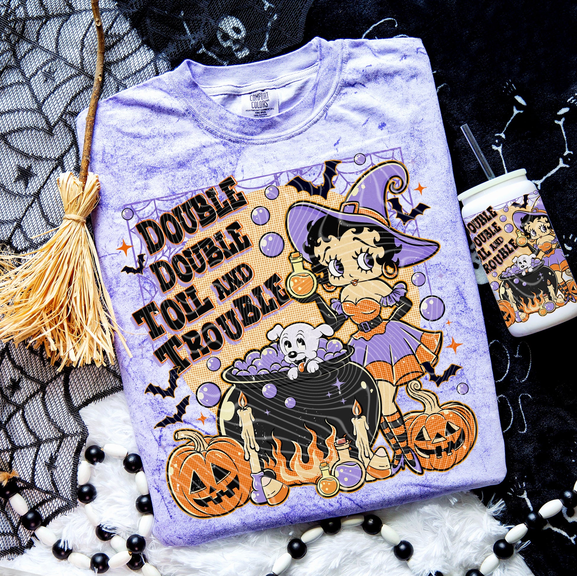 Get ready to cause some double trouble in this Betty Boop tee! With her iconic image featured twice on the front, you'll be sure to turn heads and make a playful statement. Perfect for fans of the classic cartoon and anyone who likes to add a bit of fun to their wardrobe.