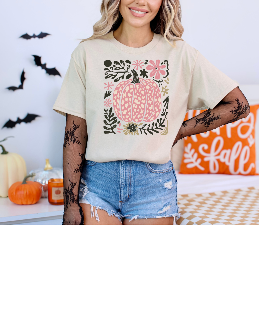 Celebrate fall with a playful twist wearing this natural-colored Bella tee featuring a charming leopard pumpkin design. Perfect for cozy autumn days, it blends seasonal spirit with a fun, trendy pattern that adds a touch of wild style to your wardrobe. Comfortable and stylish, it’s your go-to tee for pumpkin patches, casual outings, or simply embracing the cozy vibes of the season.