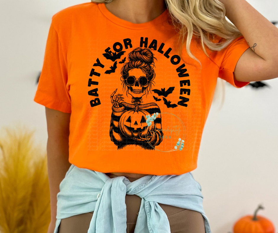 Get batty for Halloween with this cute tee! Perfect for the spooky season, this tee is a must-have for any Halloween lover. Embrace the fun and playful vibes with this quirky and humorous design.