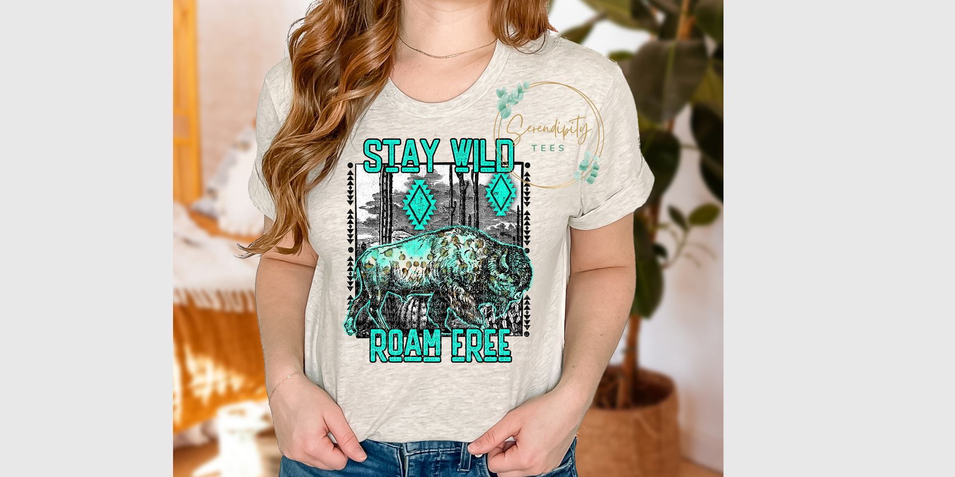 "Embrace your wild side in this playful turquoise tee with western-inspired design. Stay wild and roam free with this unique and eye-catching shirt. Perfect for those who don't take life too seriously and want to add a touch of fun to their wardrobe. Don't wait, grab yours today!"